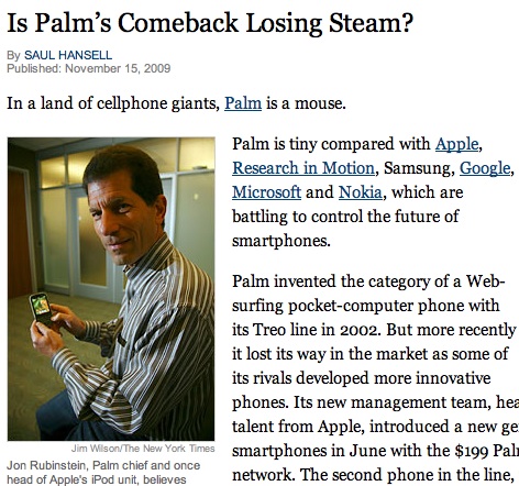 So far, so good... right? Well, somewhere along the line, the headline was changed to this: "Is Palm's Comeback Losing Steam?"