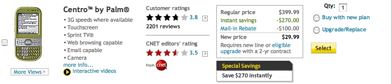 To actually purchase a Centro, he suggests you go to Sprint's site, but remarks,"I'm prepared to accept the possibility that Palm has stopped making the things and Sprint is blowing out the final production run, but it's sort of endearing to see a Palm OS phone out there in the iPhone/Android/WebOS era. At least for a little while longer. And even though I don't recommend buying it unless you really like the Palm OS, and maybe not even then..."