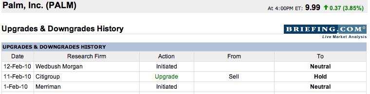PALM stock closed out last week at $9.99. There was a bit of uplifting news starting with Citi raising its rating to Hold from Sell. Another firm, Wedbush Morgan Securities initiated coverage of the shares with a Neutral rating and price target of $10.50. The last bit of uplifting news was talk about the Pre possibly arriving at AT&T in May. Also, Citibank believes that more insight into carrier interest for Palm's webOS devices may come out during the Mobile World Congress (Smartphone Experts has a team attending and will be providing reports and insights).