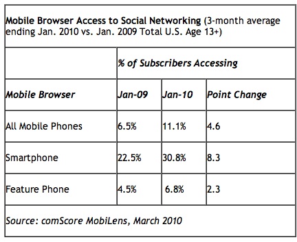 A comScore report just released states that 30.8% of smartphone users accessed social networking sites via their mobile browser in January 2010, up 8.3 points from 22.5% one year ago. Access to Facebook via mobile browser grew 112% in the past year, while Twitter experienced a 347% jump.