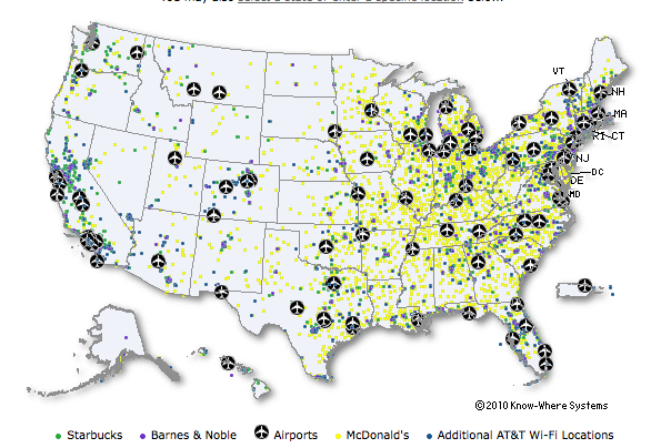 Also, on their website, AT&T has a map of their WiFi locations. By mousing over the state, you can get a top-level read on the number of hot spots and then click through to get details on a particular location.