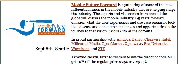 Also noted in the Chetan Sharma Consulting post, the firm has put together a unique, all-day Mobile Future Forward Executive Summit. Scheduled to participate are "some of the sharpest minds in the industry, folks who both have the vision to shape the evolution and the authority to invest billions of dollars this decade to make things happen."