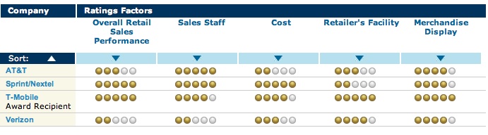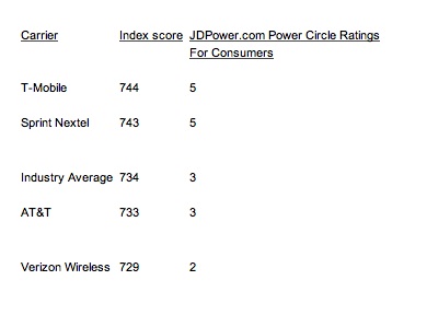 Notable was Sprint Nextel's improvement. They moved into second place behind T-Mobile USA. Bringing up the rear was Verizon.