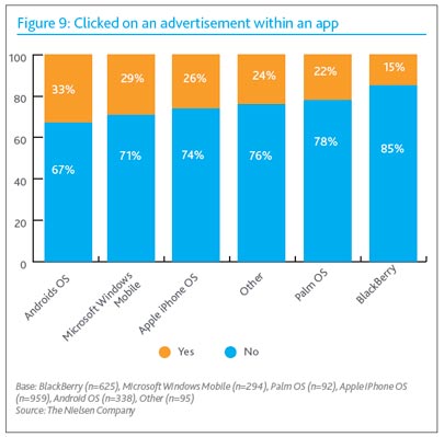 >> Android users are more likely to click on ads within apps than people using other mobile operating systems. One-third of Android users have clicked on an in-app ad compared to 29% for those with Windows Mobile, Apple's iOS, 26%, Palm, 22%, BlackBerry, 15%, and other types of operating systems, 24%. It was suggested the higher click-through rate for Android-based ads may stem from the Google platform attracting a younger audience that is more receptive to mobile ads. Android's less affluent users also show a decided preference for free apps.