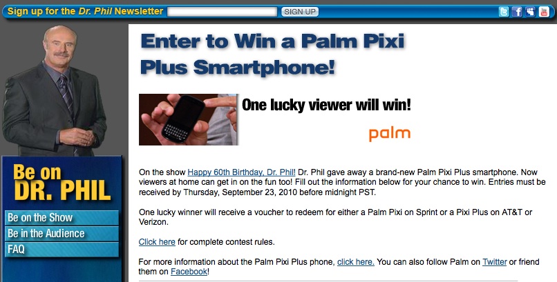 Also, note that by entering the contest and accepting the prize, each winner agrees to have his/her name, image and likeness featured on "Dr. Phil" and/or DrPhil.com and/or for use of in advertising and promotion for "Dr. Phil" without further consent or compensation.