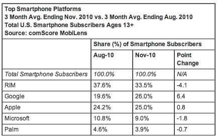 Apple accounted for 25.0 percent of smartphone subscribers (up 0.8 percentage points), followed by Microsoft with 9.0 percent and Palm with 3.9 percent.