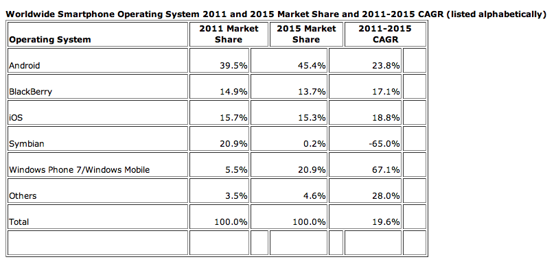 Another attention-getter -- IDC has Windows Phone 7/Windows Mobile overtaking Apple iOS by 2015. But upon further review, there is some logic behind this forecast due to the news of Nokia's shift from Symbian to Windows Phone.