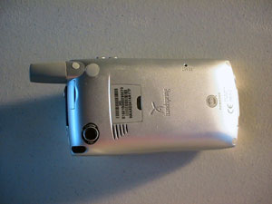On the bottom of the Treo 600 is the Hotsync port, and a standard 2.5 mm headset port. On the back is a sticker with serial numbers and IMEI numbers, attachment spots for the battery sled, and other future accessories, and on the back left is the camera.
