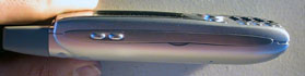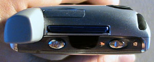 Also at top are the ringer switch and GSM SIM slot. The ringer switch is exactly like the one on the previous Treos, and is an excellent innovative feature to physically turn all sounds off. Handspring had a lot of problems with the SIM door that was in the first generation Treos. There was such an issue of the door breaking that they even reengineered a new door that they currently use on new Treo 300s and Treo 270. In the Treo 600 this issue is gone because SIMs are now inserted into a slot. There is a little sled that you pull out, you pop your SIM card into it, slide the sled back into the Treo 600 and it stays put. The Sprint phone doesnt use a SIM card.