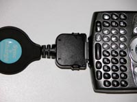The Sync & Charge retractable cable is only a few ounces and four and a half inches in length when closed, but it can extend to more than two feet. For being a portable solution, it is a killer product. In the middle of the device is the reel for the cable. The reel is made of a rubberized plastic, making it slightly soft to the touch. On this little reel is a blue button decal with Sync & Charge written on it. On one end of the cable is a USB plug, and on the other is the Treo connector. It works with all Treos. There are two little arrows on one side of the plug to indicate which way to plug it into the Treo. Sadly, there is no hotsync button on this device, forcing users to launch hotsync through the Palm OS launcher, or as I do, through a pre-assigned favorite key.