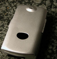 The Innopocket Aluminum Hard Case for Treo 600, $34.99, is a form fitted hard case for the Treo 600. As the name suggests, it is made out of very thin anodized aluminum, adding only about half a centimeter of depth, and half a centimeter of width to the Treo. It weighs about 55 grams. The entire Treo is covered, including the screen and keyboard. There are cutouts for all the details of the Treo: speaker, microphone, hotsync, camera, reset pin, and even the 5-way navigator. On the sides of the case there are little rubber nubs to provide grip when holding the case. Inside, the case is covered in a thin neoprene. Inside the cover, a slide-in SD cardholder is included. Nifty feature. The Treo is held in the case by the friction with the neoprene, and also by a small metal tab that clips into the back of the Treo at the accessory attachment point.