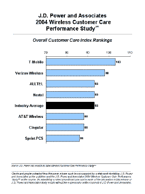 T-Mobile ranks highest among the seven largest wireless service providers in satisfying customers who call their provider for service or assistance, according to the J.D. Power and Associates 2004 Wireless Customer Care Performance StudySM released today.