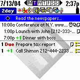 2day is a "Today" type application. The idea behind it is to show all of your information that is important for the day on one page. This includes a detailed list of calendar and todo items for the day. But, that has been done before. What makes 2day special is that it also interfaces with many popular communications software for the Treo 600. This means that on the main page, voicemail indicators missed calls, alerts, SMS indicators, email indicators for Mail and SnapperMail, IM indicators for Chatter and VeriChat, and voice memo indicators for SoundRec and Audacity are displayed at top. In one glance one can view all important information on your Treo 600.