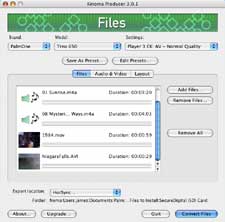 First thing I needed was some movies. The primary purpose of the program is to reencode movies and audio files into a format suitable for the Treo. Both the Windows and Mac versions of Producer can import unprotected MPEG-1, MPEG-2, MPEG-4, MS-DVR, QuickTime, WMV, WMA, AVI, DV, DivX, MP3, AIFF, AU, and the Windows version can also convert many other DirectShow compatible formats. There are dropdown boxes for specifying which handheld you own. There are different settings for the Treo 600 and Treo 650, and even support for Handspring Visor models.