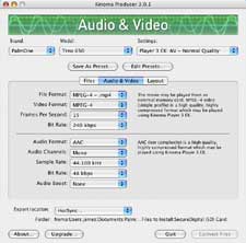 If you go into the Audio & Video or Layout tabs, there are some advanced options, such as .mov or a proprietary Kinoma Movie format. Normal movie file defaults for the Treo 650 are MPEG-4 format at 15 FPS and 240 kbps bit rate. Normal audio file defaults are AAC Mono at 44.1 kHz with 48 kbps bitrate. You can customize these settings, but I was quite satisfied with the results when i played them on the Treo. A smaller bit rate will generate a smaller file but at a lower quality.Next Page: Kinoma Player EX >>
