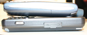 Strangely the P50 has its SD card slot located at the bottom of the phone, where the sync connector is on the Treo. At the bottom you will also find a barrel like power connector. The sync jack (which is a mini-usb connector) and the headset jack is located 2/3 up the right side, which makes it very hard to use a slide-in cradle or a docking car-kit with the P50. Advantage Treo 650.
