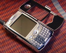 The Treo slides into the case from the top. It is a snug fit as the thin protective layer of neoprene both protects and holds the unit very securely in place. On three places on the sides of the case are plastic strips to aid in gripping the case. The case, made out of anodized aluminum, is strong and extremely lightweight.