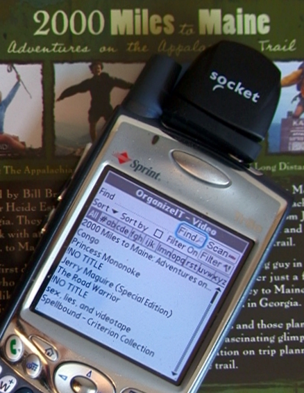 Im sure that there is an old adage: hardware is only as good as the software that runs on it. The OrganizeIT Suite adds thirty dollars to the price of purchasing the bar code scanner alone. It is is a database application that organizes your DVDs, CDs and VHS tapes. The scanning procedure is simple. Start up the video or CD application on the Treo and an inelegant screen pops up. Select a new record, and then click on the button you have assigned to the scanner and point it at the barcode. When successful, you are rewarded with a cool zapping sound. Like all scanners, you have to get the angle right, which for this scanner only takes a few practice tries. It also scans through shrink wrap with no problem.