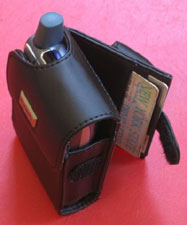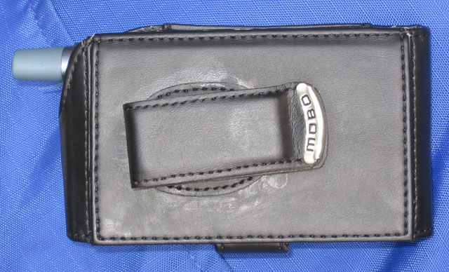The leather of the MOBO Wallet Organizer feels good and is a matte black with black stitching. The front flap has MOBO engraved on a little plate. Speaking of that front flap, this is a vertical pouch case. The Treo slides into the top and a flap drops over the top where an invisible magnet snaps it into place.