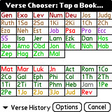 When reading the Bible, you can switch among translations by tapping the translation name in the titlebar or going into Tools | List of Bibles. Switch books of the Bible by tapping the book/verse or going into Tools | Verse Chooser. The books of the Bible are color-coded, and unfortunately you must tap on a book instead of selecting with the navigator buttons. You can either go directly to the chosen book of the Bible or specify the chapter and verse, which is handy when you want to read a quick passage that the Pastor mentions during a sermon.