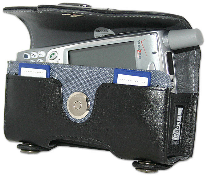 The Horizontic Plus uses a magnetic snap to keep the Treo secure inside. There are generic cutouts on the sides of the case; the best way to carry the Treo is with it facing towards the inside of the case. This allows access to the audio jack on the bottom of the Treo.