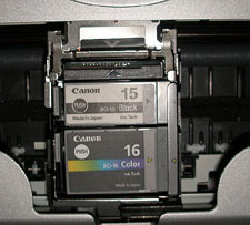 The ink tanks are very small. Thats the bad part. The good part is that unlike other/older printers, the print head is not part of the ink tank; its a separate carrier for the tanks, so new ink tanks are relatively inexpensive, compared to the kind that have the print head built-in. (And heed this warning: stick with genuine Canon inks. They might cost a little more, but youre really taking a risk buying cheap no-name clones that could foul the precision print head and lead to an expensive replacement, because Canon WILL void your warranty if print head failure was caused by using cheap no-name inks!). As mentioned, theres no paper eject tray, so prints just kind of spill out the front and land, well, that depends on where you put the iP90.