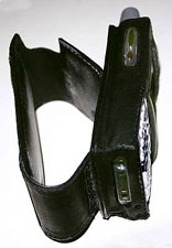 Slipper appears well made. The package doesn't state where - but their main factory's in Mexico - of quality materials. Crafted in fine Napa leather [Napa is sheepskin, not cowhide. The company admits it's using the term "Napa" loosely. The product is cowhide, but they call it "Napa" to indicate its designer-desirable qualities. Does it matter if it could once moo or baa? It's nice, either way.] However, placement of some of the cutouts could be better. In addition, the thin strap crosses the Treo too close to the "Home" and "Menu" buttons. That strap couldn't get much narrower, but it could move up a few important millimeters to make room for big ol' fingers. Other openings could use some refining, too. They don't quite align.