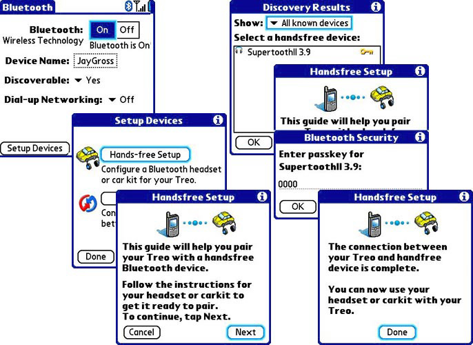 You can't just turn on the Treo's Bluetooth and have it "Find" the device. The simple, not very intuitive setup process necessitates (gasp!) the user manual, a nicely printed multi-lingual affair that tells its story with photo illustrations. Here goes.First the Treo. Fresh out of the box, its Bluetooth networking feature defaults to off. Tap Bluetooth on the applications screen, and turn the network on with the icon. Tap "Setup Devices" at lower left.