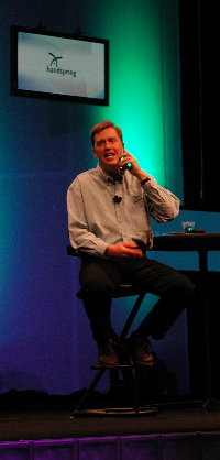 Not that Hawkins didn't take a few shots at Microsoft. When he outlined the keys of handheld computers: size, ease of use, reliability, and utility, Hawkins used an image of the Scandisk screen for his slide on reliability (the crowd gave a good laugh on that one). After tallying up how often he saw that screen, Hawkins said that 200 lifetimes are spent each year looking at that blue Scandisk screen that comes up after Windows crashes.