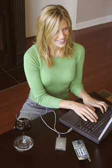 According to MVox's screed, the MV900 is a portable and true hands-free speakerphone with DSP (digital signal processing) and speaker- independent voice dialing. The company says that it is the ideal communication solution for any mobile professional using it in the car with a Treo 650 or 700w, or using it with a computer to make conference calls through Voice over IP, like Skype, as demonstrated here by our lovely model.