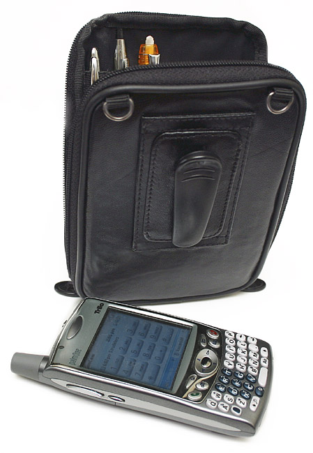 The micro fiber case's outside pocket is designed to hold your Treo, but it's just the right size and shape for reading glasses (sunglasses for the more hip among us). The pouch's built-in opening allows the Treo's antenna to poke through. Zipped inside the case, the phone works fine in areas with good signal strength, so don't worry too much about not using the antenna slot if you need the space to store your glasses.