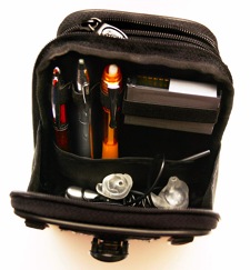 Like its bigger brother, this organizer clips to a belt or other surface, or threads onto a belt, or dangles from a snap-on neckstrap, which is included. Its internal pockets store credit cards, SD storage cards, folding money, coins, business cards, headset or earpiece, a couple of ferrets and your Pomeranian. Okay, not the wildlife, but there's room for a bunch of stuff.