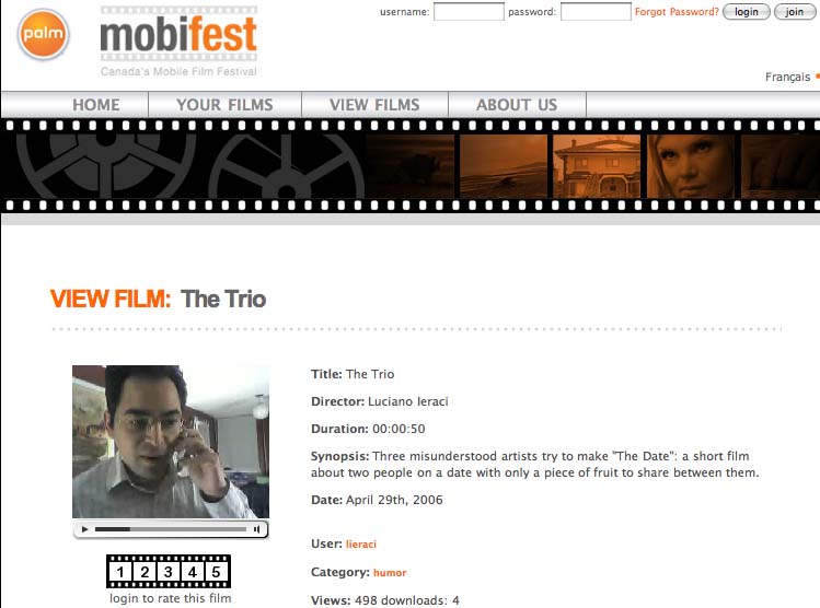 "The Trio" directed by Luciano Ieraci, won in the "Caught on Treo" category. According to the synopsis, three misunderstood artists try to make "The Date": a short film about two people on a date with only a piece of fruit to share between them.