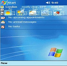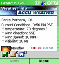 Figure 7. Brand-n-Go is a multi-functional program for both the Pocket PC and Smartphone with a weather component. The right screen shows the current weather. Scroll down for a five-day forecast.