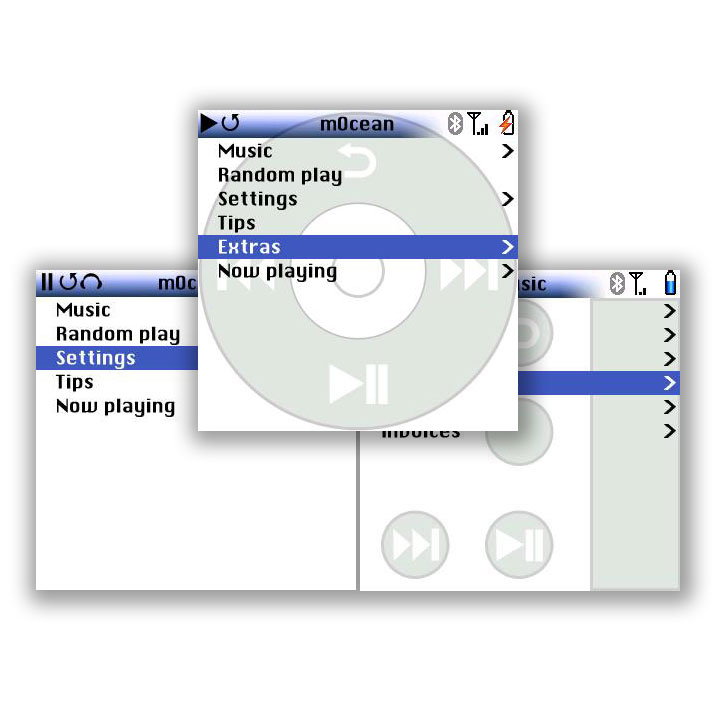Menu selections operate by rotating the virtual wheel with your fingertip, then clicking on a selection either on screen or with your 5-way pad. Some of mOcean's feature selections are Music, where you select playlists and Settings where you control sound and interface styles. When you select an option, the screen slides to the right, and back to the left, just like an iPod or similar players typically do, as you navigate forwards and backwards through the menu system.