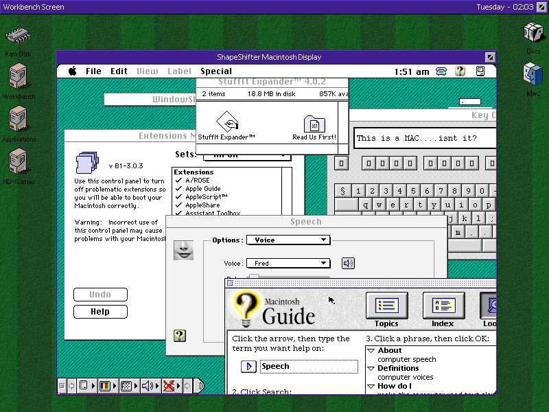 Some time ago, just for grins, I did exactly that; I set up an Amiga emulator (UAE ) on a PowerMac, and then ran Shapeshifter (a Mac emulator for the Amiga) on top of it just to prove it was possible. While it was slower than snot and far from fun to use, it actually worked!! It was a Mac running an Amiga running a Mac; Kind of twisted, but certainly, bitchin' to see.