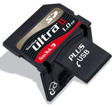 The SanDisk Ultra II USB folding SD card is, in my opinion, the absolute best way to go here. It saves a lot of hassle dealing with cables, card readers, converters and such, and the 512Mb version costs less than $50 these days.