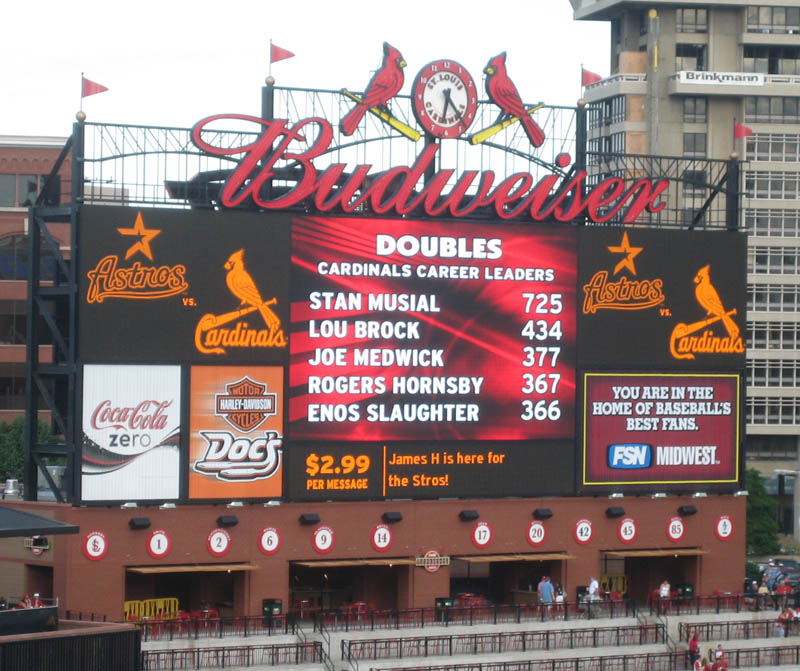 So I took lots of pictures. As I looked around, one really neat feature of Busch Stadium is its scoreboard. For $2.99, you can send a text message from your phone to a special number and have it displayed on the scoreboard for everyone to see. If you do it before the game, the message is displayed on the main scoreboard, while during the game messages go on one of the smaller side boards.