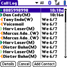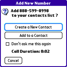 After a call is finished, the Treo 700p shows a vastly improved Add to Contacts screen, with options to create a new contact, add to an existing contact, cancel, or to not ask me again. This is one of my favorite features of the Phone application on the Treo, and along with me, many folks have been clamoring for the ability to add to an existing contacts for years. The call log application has also had a major bug fixed; the default five-way selection is now the first number, not cancel.
