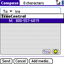 Adding recipients is easier and slicker than ever. Simply type in the contact's initials or name, and a drop down box, reminiscent of those on the Treo 700w, shows up with the phone numbers matching the contact. Very simple, this method is far better than selecting lookup contact on the 650 and having to use a new form to select the contact. Of course, my favorite feature of messaging is still there: the automatic threading feature that groups all messages between you and another person in one instant messaging chat-like display. I have not met a phone that makes text messaging easier and more fun than the Treo 700p.