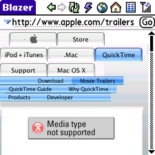 The newest feature of web browser is a built in video and audio player that can stream some content from the internet, such as WMAs, WMVs, and MP3s. Macromedia Flash, QuickTime and RealPlayer videos will not work. In such cases, a large "Media not supported" button rears its ugly head. I think that the built in video player is a great feature, but because it only supports a few of the most popular video formats it falls short.