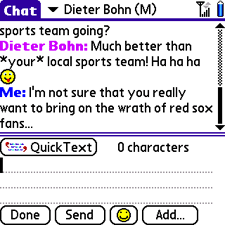 Michael: Text messaging on a Treo is one of the best Treo experiences, and Palm only made it better on the Treo 700p. The Messaging client on the Treo 700p went to a spa and got a facelift much improved over 650. The compose message window is split up into attractively highlighted text input areas, that change from grey to white when selected. Quicktext and Smilies are still only a button away, as well as adding media which now shows up as a separate bubble when selected.