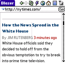 Michael: Internet browsing, done through an application named Web (which is still good old Blazer), is a completely different experience with EVDO's speed. Pages that used to take minutes download and render in only a few seconds. Web includes pretty good support for CSS, JavaScript, SSL, downloading files, and nearly all image formats used online. For faster viewing, you can switch to an image-less rendering with one tap. Web tries to reformat pages to view in one column, but on some sites, it's easier to view the webpage in wide screen mode with both vertical and horizontal scroll bars, which is only a menu option away.