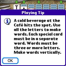 The Beach, Café, and Train Station puzzles give you increasingly difficult challenges. The train puzzles contain the entire alphabet, while the others stop short of inflicting Q, Z and other notorious Scrabble extra pointers. If you get stuck, peek at the deck, hit "Undo" or just start over.