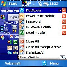 Tapping the HandySwitcher icon drops down a menu showing all running programs with the options familiar in all the task managers we have discussed.