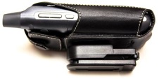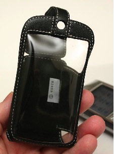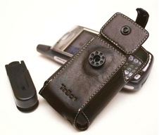 The Treo slides into the case easily. The fit is snug, but not what I'd call "tight. A stitched leather snap flaps across the top, leaving the ring/vibrate switch accessible, as well as part of the IR window, and securely holds the phone. The belt clip is a two-parter. The case has a plastic button integrated into its back. We're talking non-removable here, except perhaps by jackhammer. Or dynamite. A movable snap catch comes in the package. Together, they secure your Treo to the waistband of your favorite kilt.