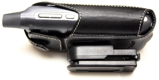 The cleverly designed catch will thread onto a belt (not a very thick one, however), or snap over one (thick, no problem), or a belt loop, occupied or not, or grip onto a horizontal, vertical, or angled cloth or leather surface. A catch holds the Treo in the slide so it can't fall out. Rotate the catch 360 degrees to orient the Treo to your liking, even upside down. Detents keep it from spinning freely. Nice.