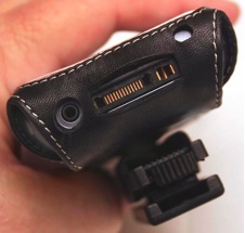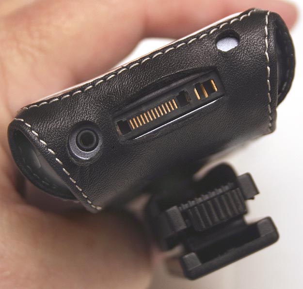 As for water, well, the case's materials could withstand precipitation aplenty, but the top SD slot (and SIM slot if your 650 has one) would not welcome even a single raindrop. Inverting the Treo won't help, as the bottom ports glare out through cutouts in the leather, and water is definitely forbidden. I therefore pronounce this case: not rain friendly. Use an umbrella, or tuck the Treo in your pocket till the rain goes away.