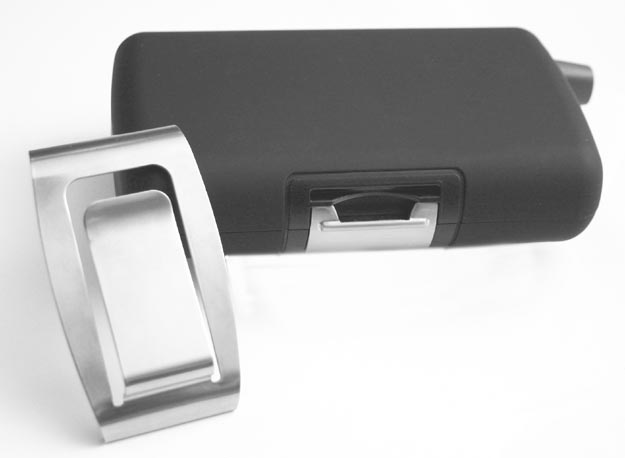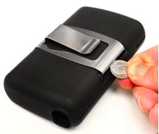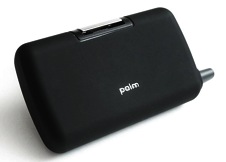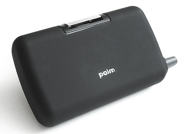 In the accompanying product photographs, I've tried to render the smooth feel of the outside case, so the case looks a little lighter than it really is. The real color is basic black, a classy contrast with the chromed clip(s) and the Palm logo. Yes, those are my fingers wielding the dime.