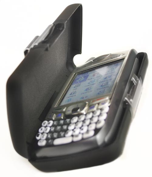 To solve this problem, it's tempting to wish the case's hinge would permit the halves to open wide, even flat. However, that would probably increase the danger of (gasp!) dropping the Treo on its way in or out -- one-handed or not. Maybe you can manage the maneuver blindfolded with two toes tied behind you. Maybe you teach in a magicians' school and you can also pull aces out of a bunny's hat.